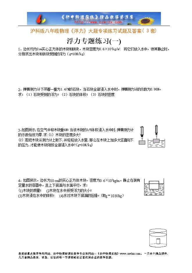 3.如图所示,在空气中称木块重6N;当该木块的3/5体积浸入水中时,弹簧测力计的示数恰好为零.求:(1) 木块的密度多大?