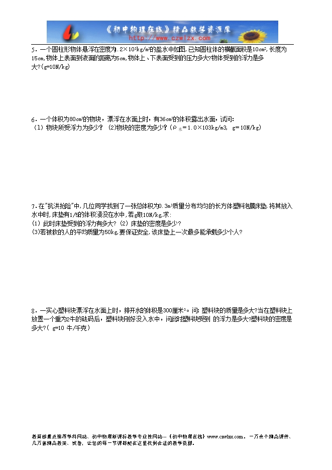 5.一个圆柱形物体悬浮在密度为1.2×103kg/m3的盐水中如图,已知圆柱体的横截面积是10cm2,长度为15cm,物体上表面到液面的距离为5cm,物体上、下表面受到的压力多大?物体受到的浮力是多大?(g=10N/kg)