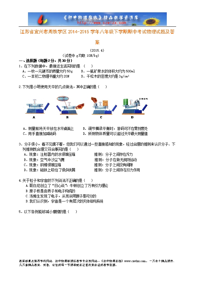 江苏省宜兴市周铁学区2014-2015学年八年级下学期期中考试物理试题及答案
