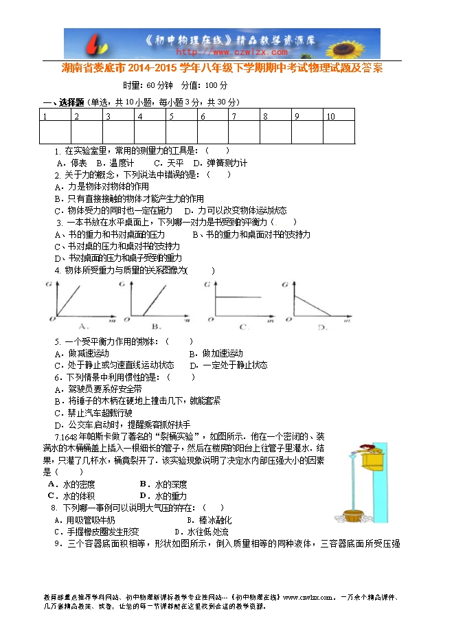 湖南省娄底市2014-2015学年八年级下学期期中考试物理试题及答案