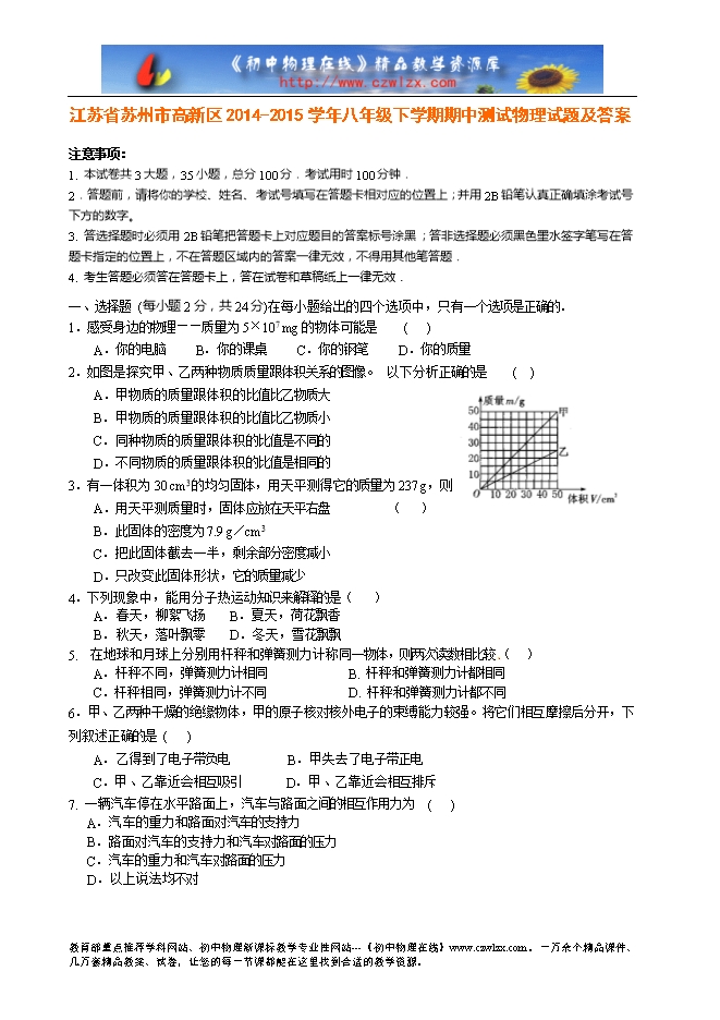 江苏省苏州市高新区2014-2015学年八年级下学期期中测试物理试题及答案
