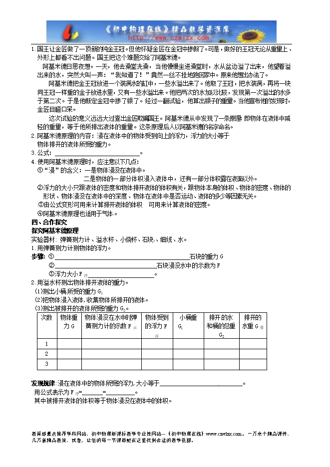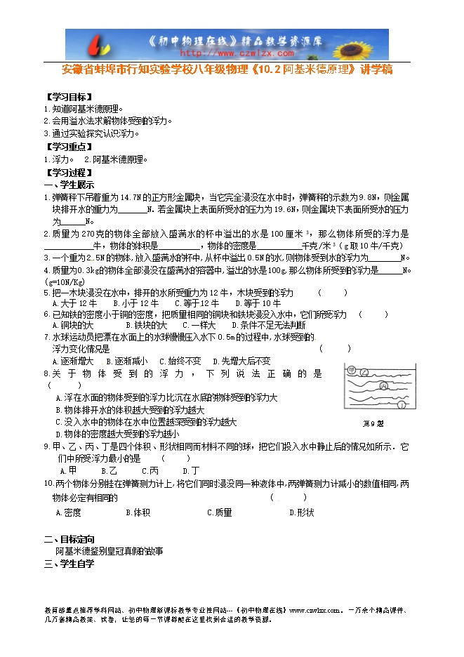 安徽省蚌埠市行知实验学校八年级物理《10.2阿基米德原理》讲学稿