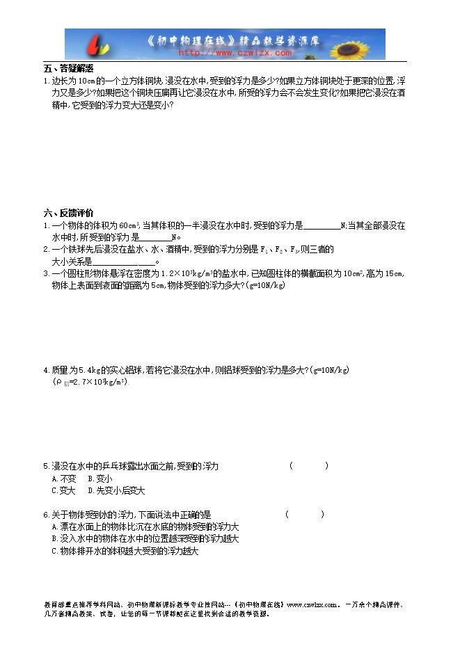 6.已知铁的密度小于铜的密度,把质量相同的铜块和铁块浸没入水中,它们所受浮力 ( )