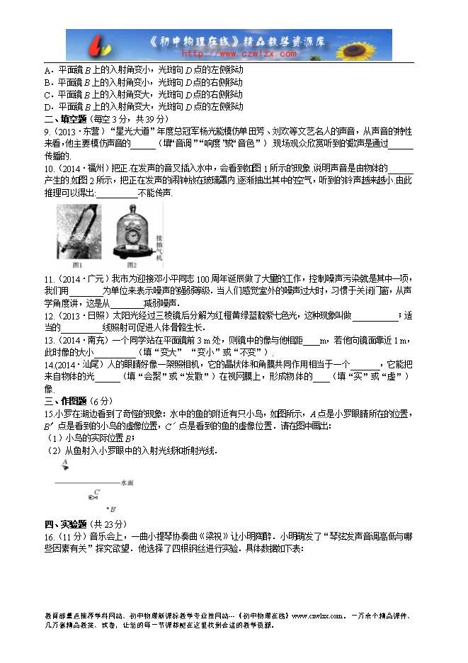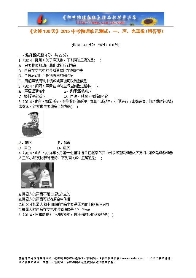 《火线100天》2015中考物理单元测试:一、声、光现象(附答案)