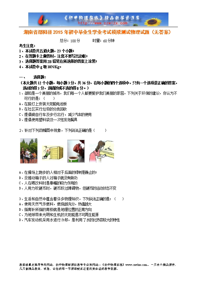 湖南省邵阳县2015年初中毕业生学业考试模拟测试物理试题(无答案)