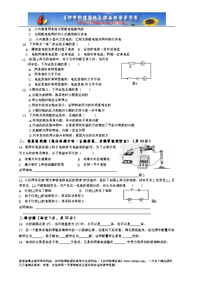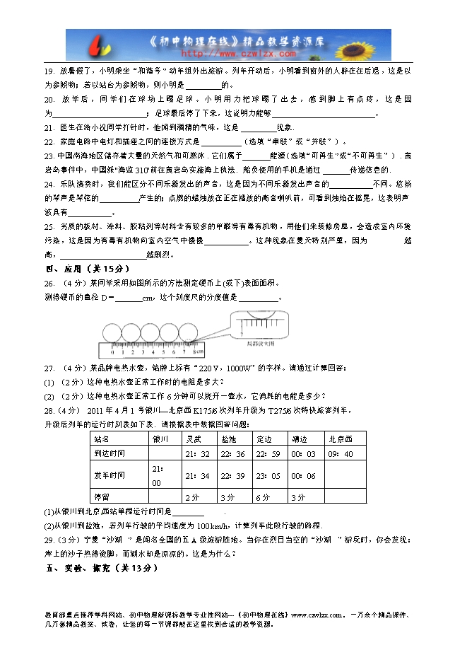 宁夏宽口井中石油希望学校2014-2015学年第二学期九年级物理第一次模拟试卷(无答案)