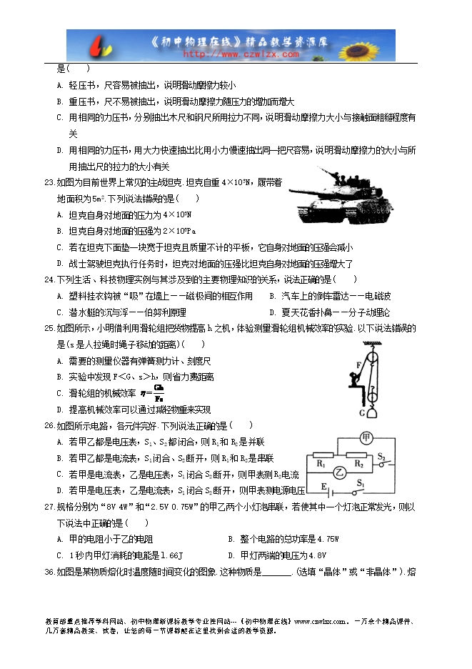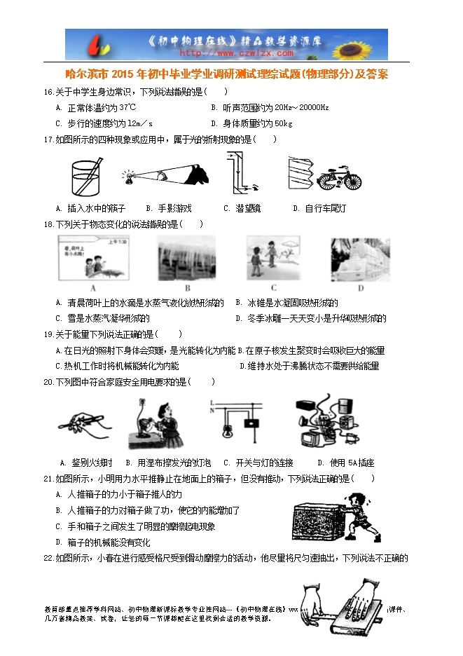 哈尔滨市2015年初中毕业学业调研测试理综试题(物理部分)及答案