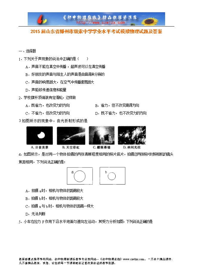 2015届山东省滕州市级索中学学业水平考试模拟物理试题及答案