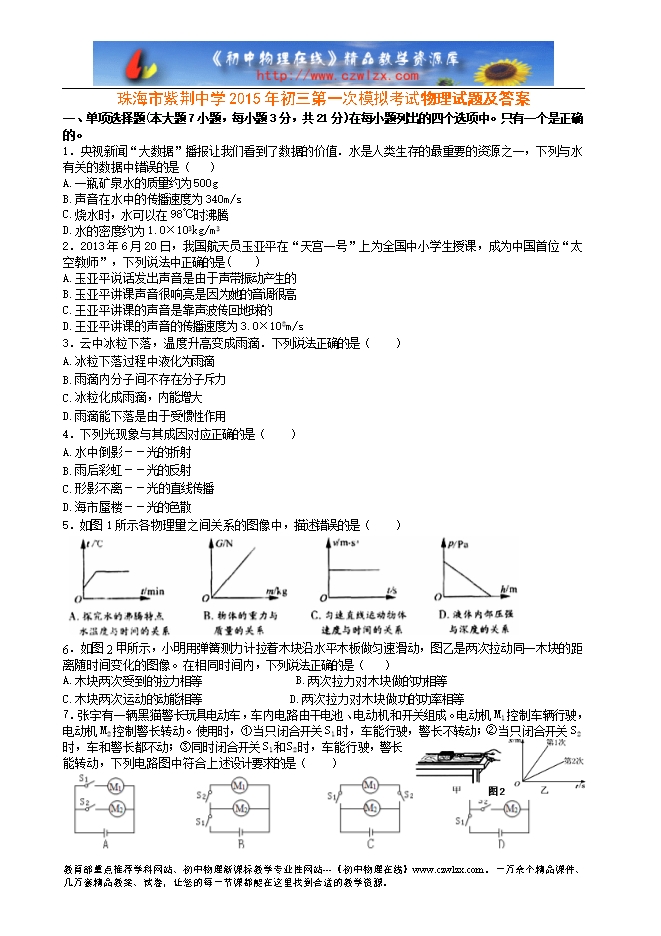 珠海市紫荆中学2015年初三第一次模拟考试物理试题及答案