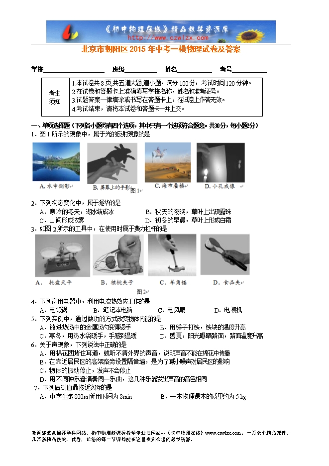 北京市朝阳区2015年中考一模物理试卷及答案