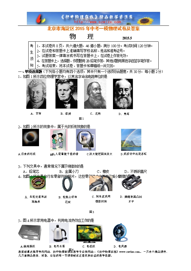 北京市海淀区2015年中考一模物理试卷及答案