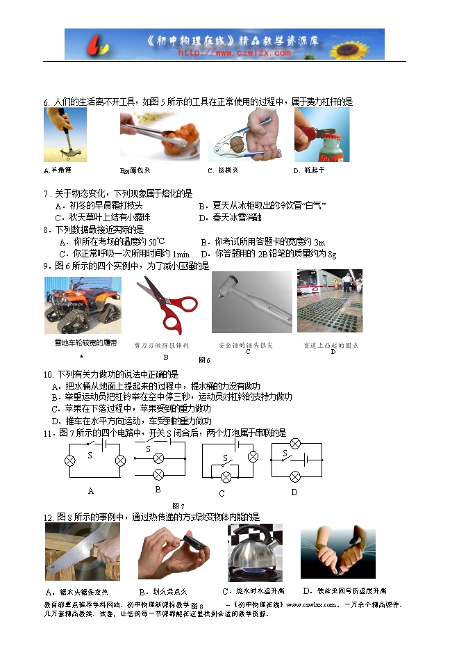 6. 人们的生活离不开工具,如图5所示的工具在正常使用的过程中,属于费力杠杆的是