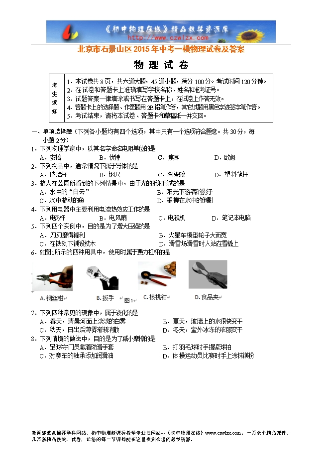 - 下一份试卷:北京市门头沟区2015年中考一模物理试卷及答案