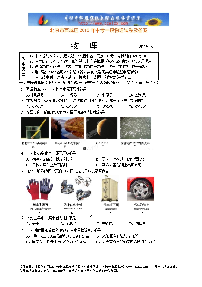 北京市西城区2015年中考一模物理试卷及答案