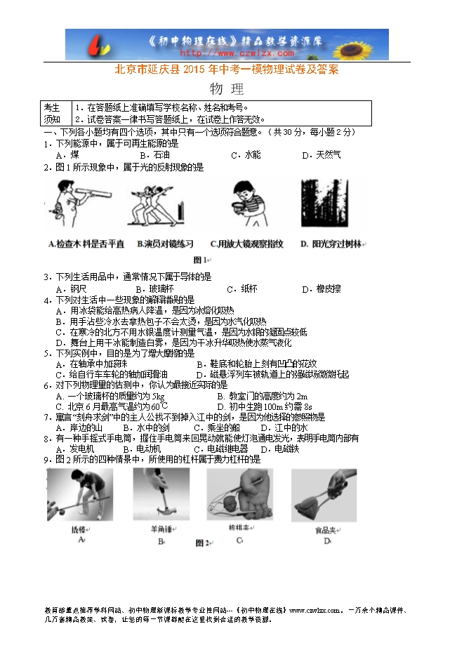 北京市延庆县2015年中考一模物理试卷及答案