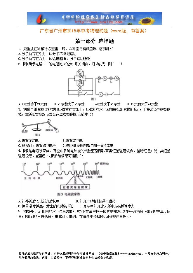 广东省广州市2015年中考物理试题(WORD版,有答案)