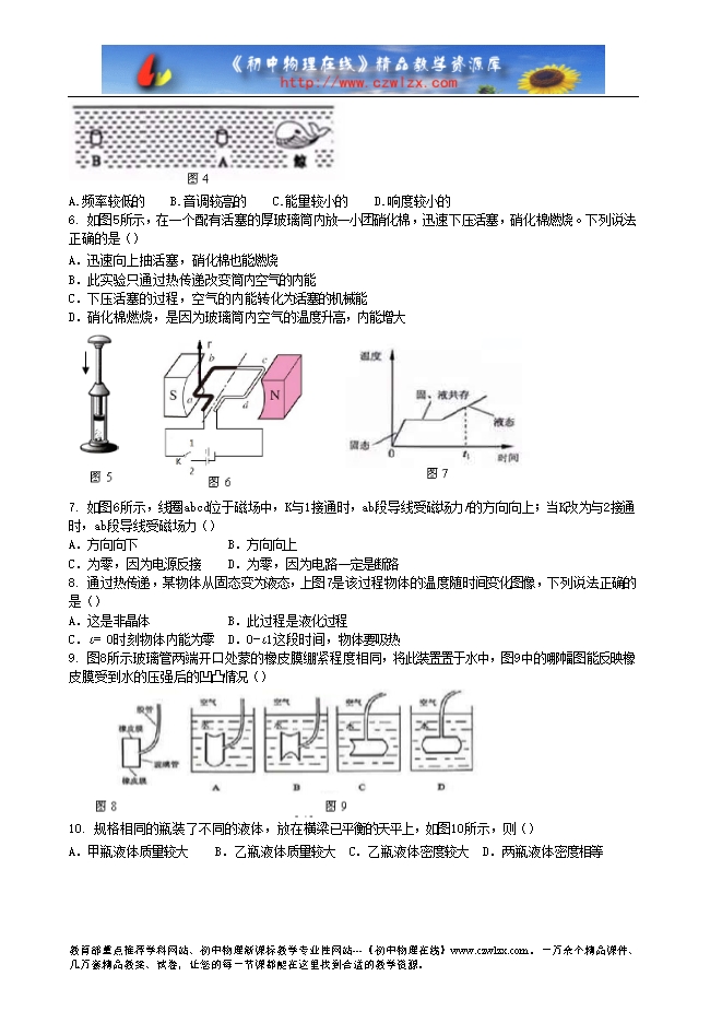 5. 如图4所示,相同的水下录音装置A、B录下在海里同一位置的鲸发出的同一段声音.A录到的有高、低音,B录到的只有低音,由此可以推测:在海洋中传播较远距离的声音是()
