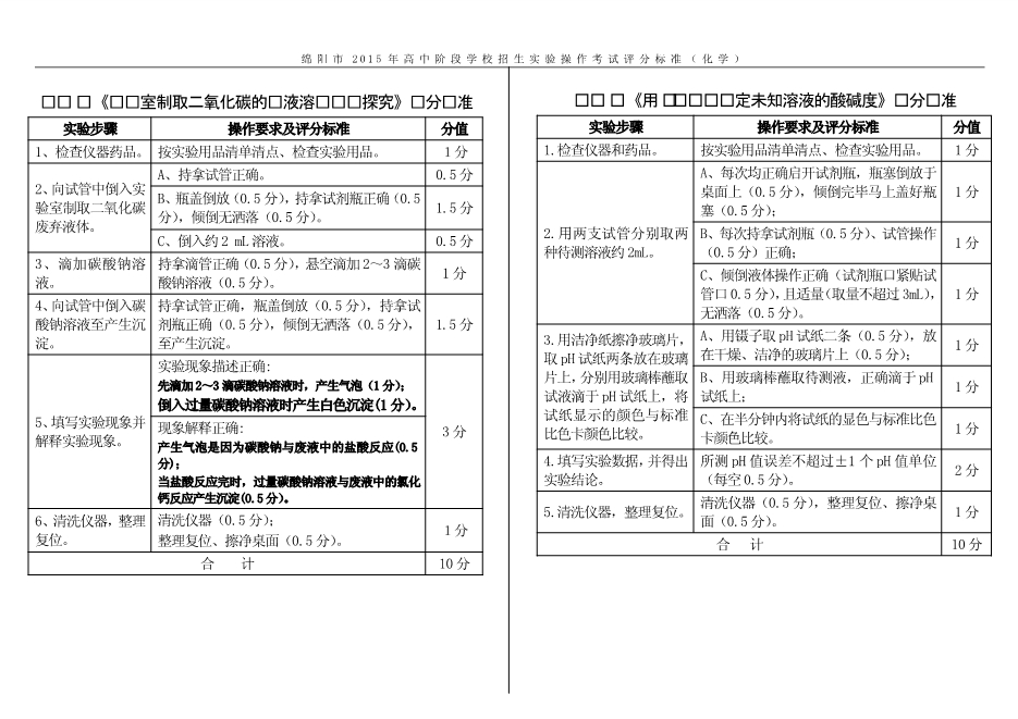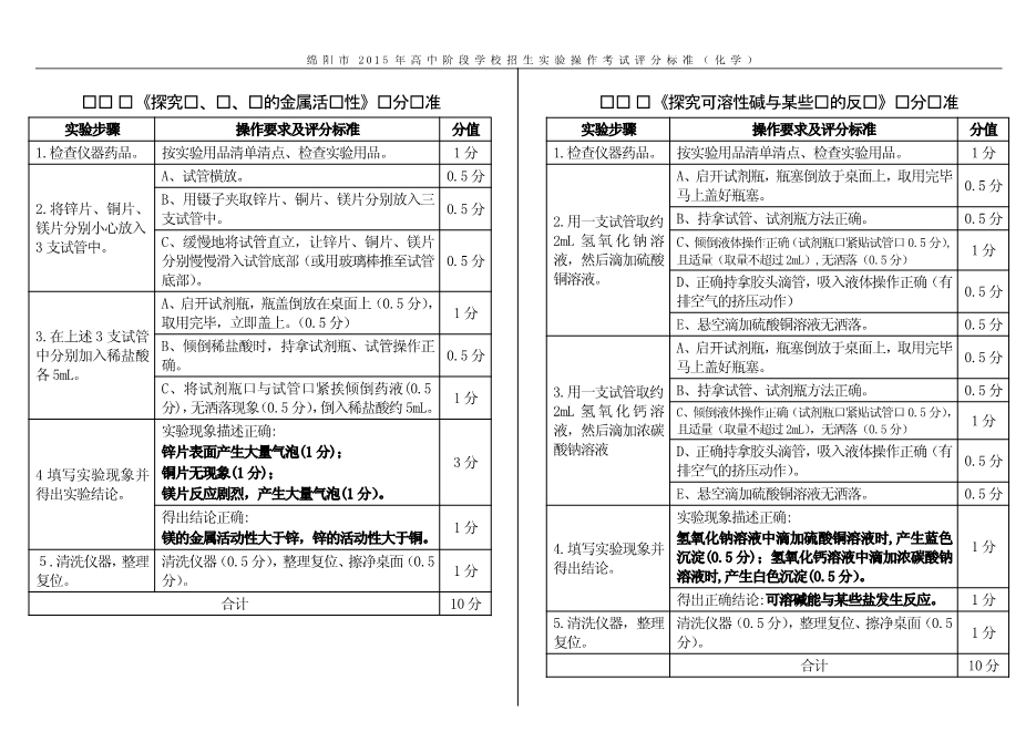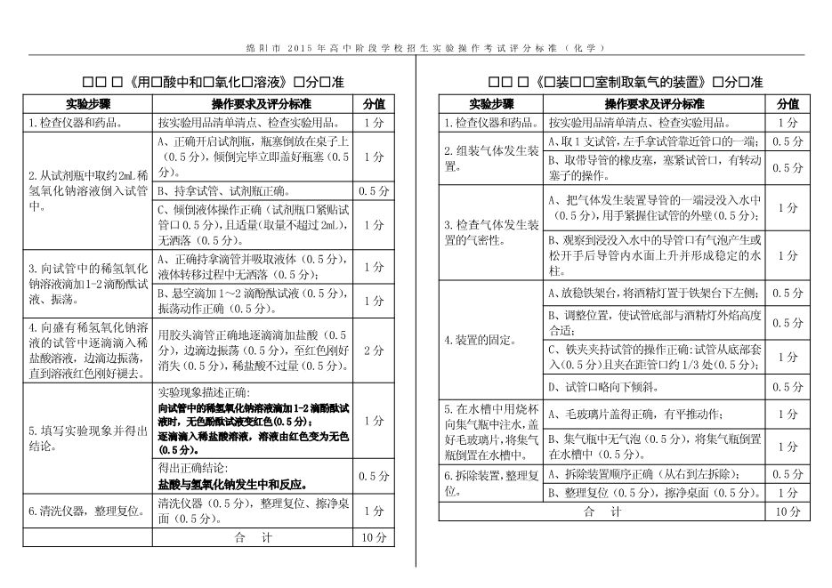 2015年四川省绵阳市高中阶段招生实验操作考试试题及评分标准(PDF版)