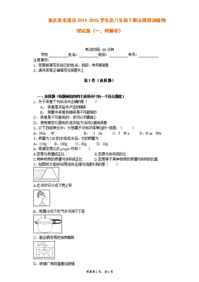 重庆市巫溪县2014-2015学年度八年级下期末模拟训练物理试题(一,附解析)