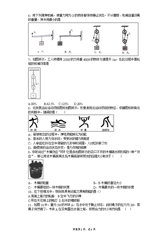 6.用下列简单机械,使重力同为G的物体都保持静止状态,不计摩擦、机械自重及绳的重量,其中用最小的是