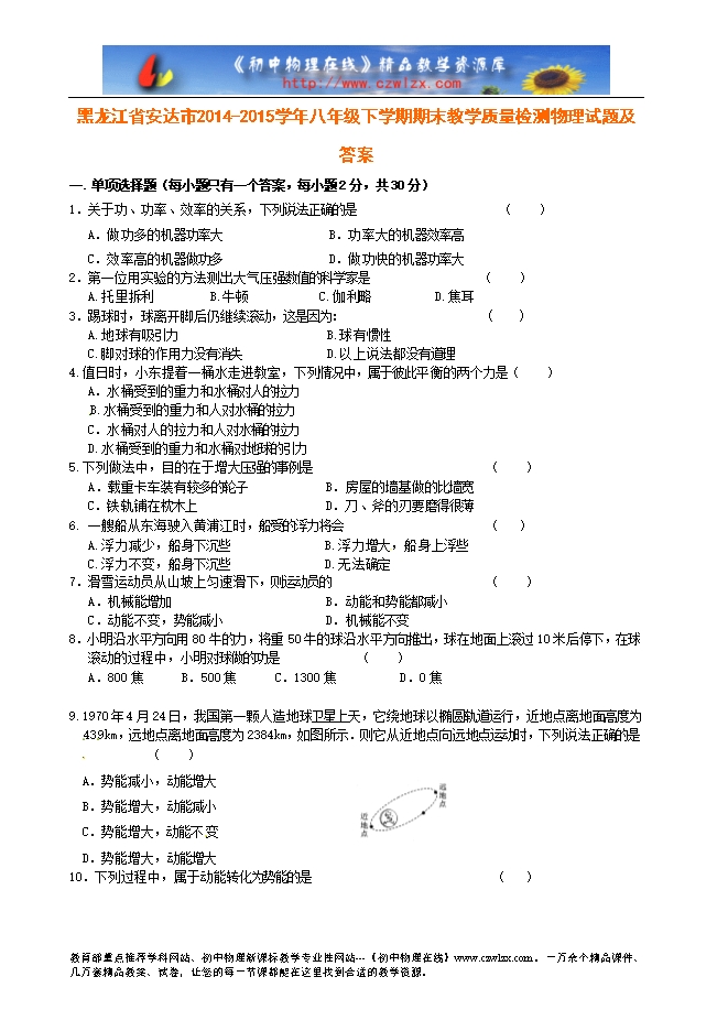 黑龙江省安达市2014-2015学年八年级下学期期末教学质量检测物理试题及答案