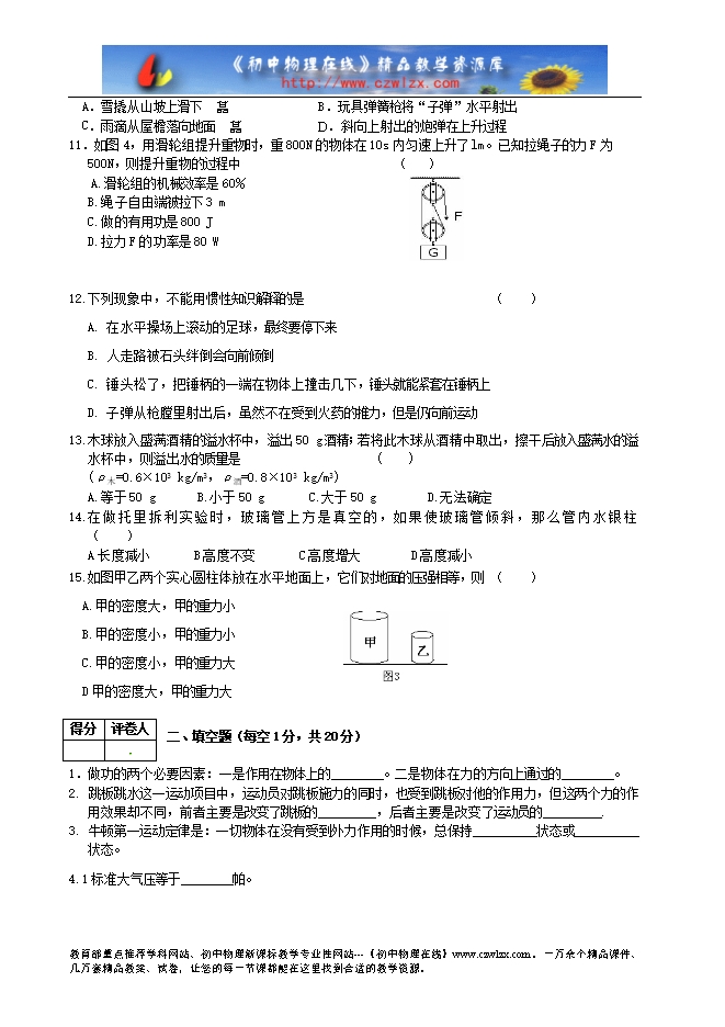 4.值日时,小东提着一桶水走进教室,下列情况中,属于彼此平 衡的两个力是( )