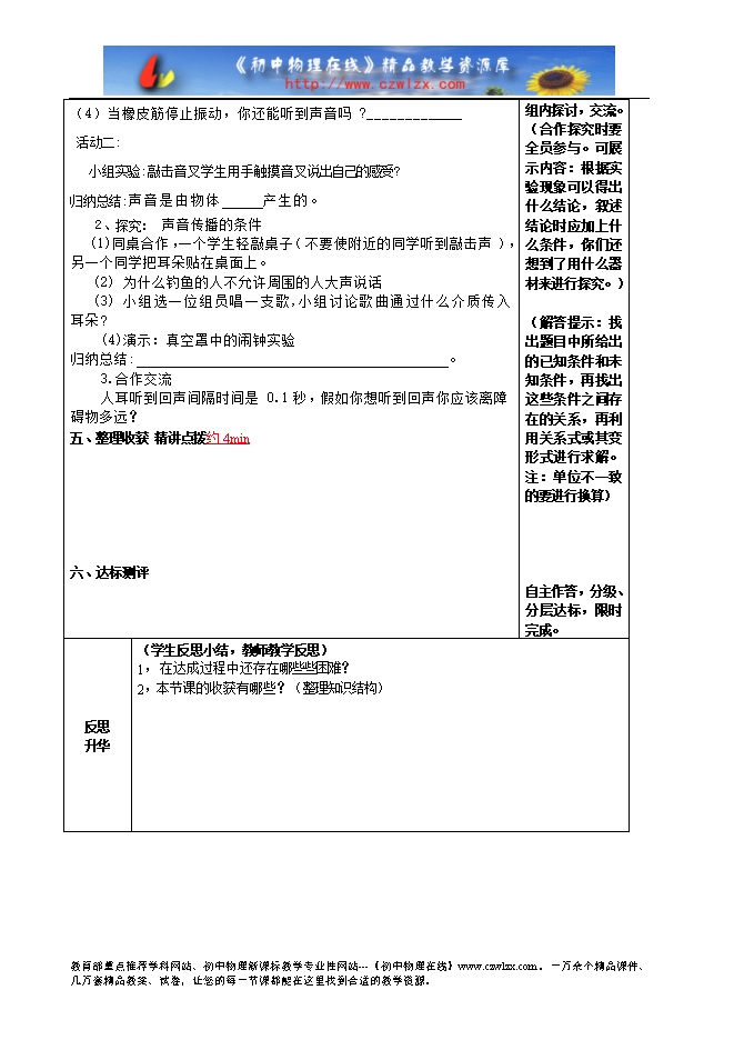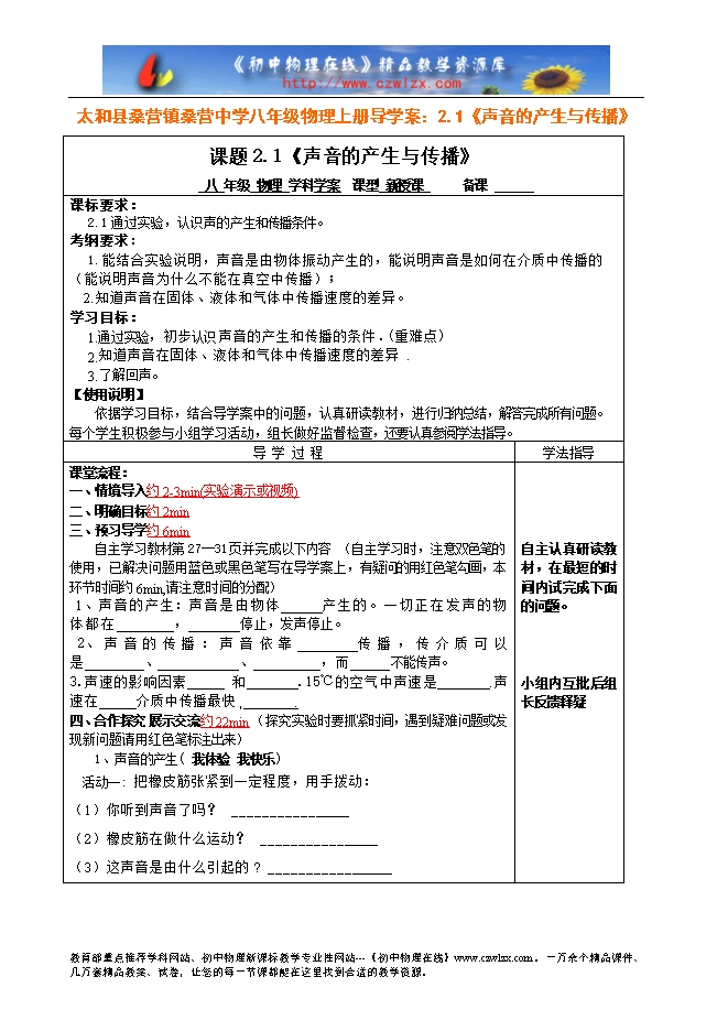 太和县桑营镇桑营中学八年级物理上册导学案:2.1《声音的产生与传播》