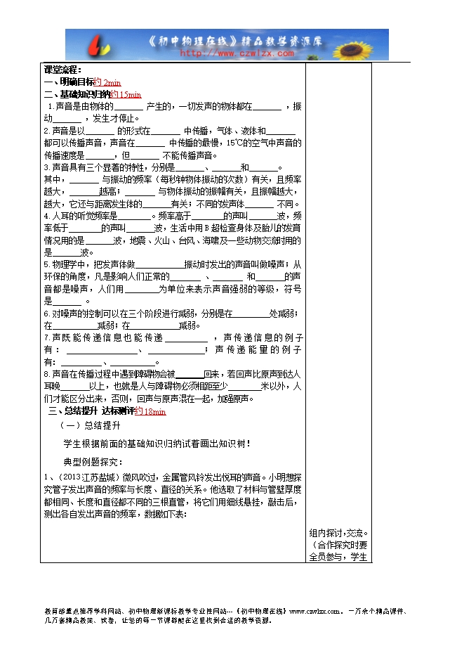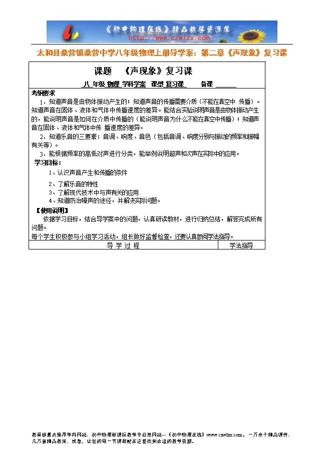太和县桑营镇桑营中学八年级物理上册导学案:第二章《声现象》复习课