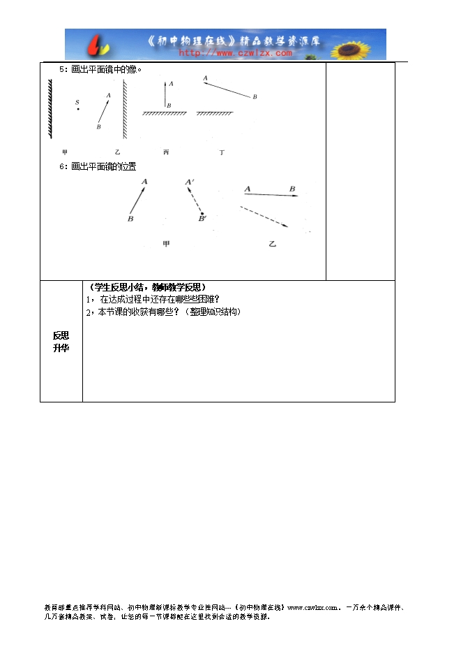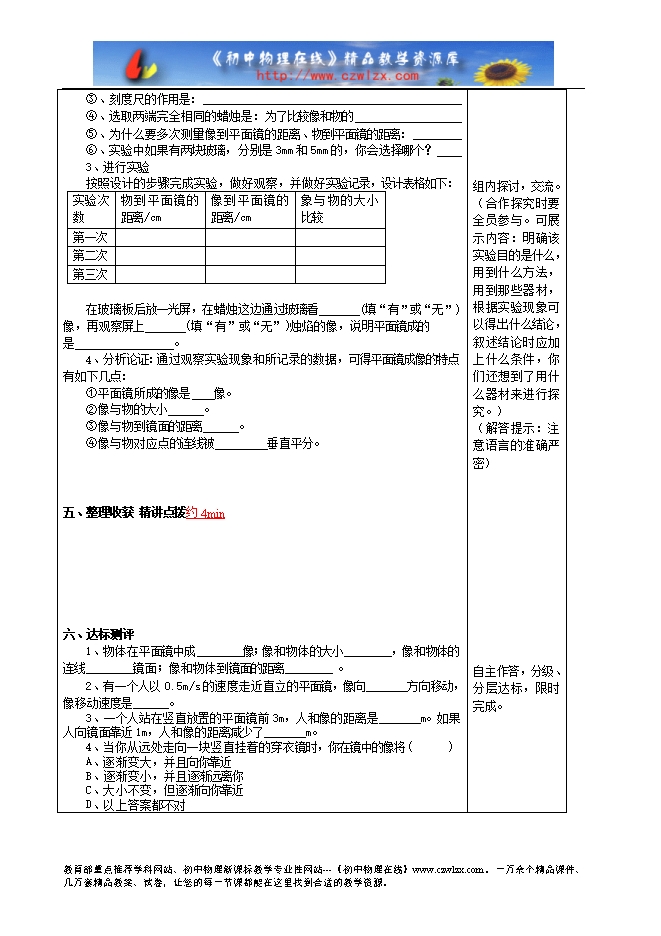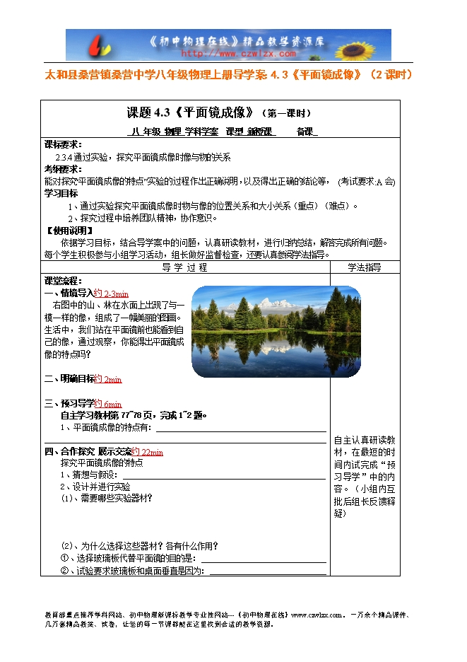 太和县桑营镇桑营中学八年级物理上册导学案:4.3《平面镜成像》(2课时)