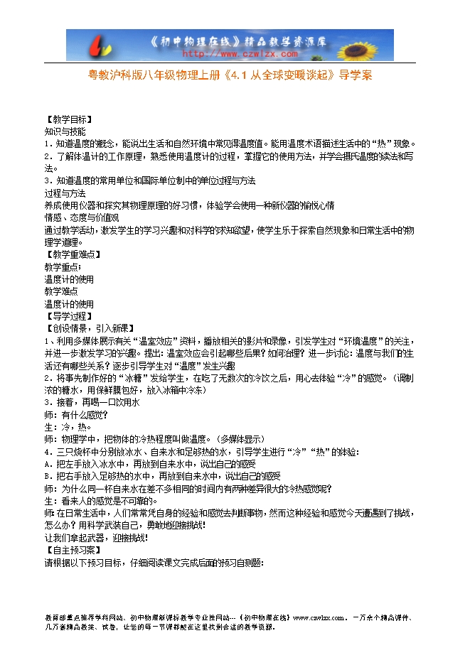 粤教沪科版八年级物理上册《4.1从全球变暖谈起》导学案