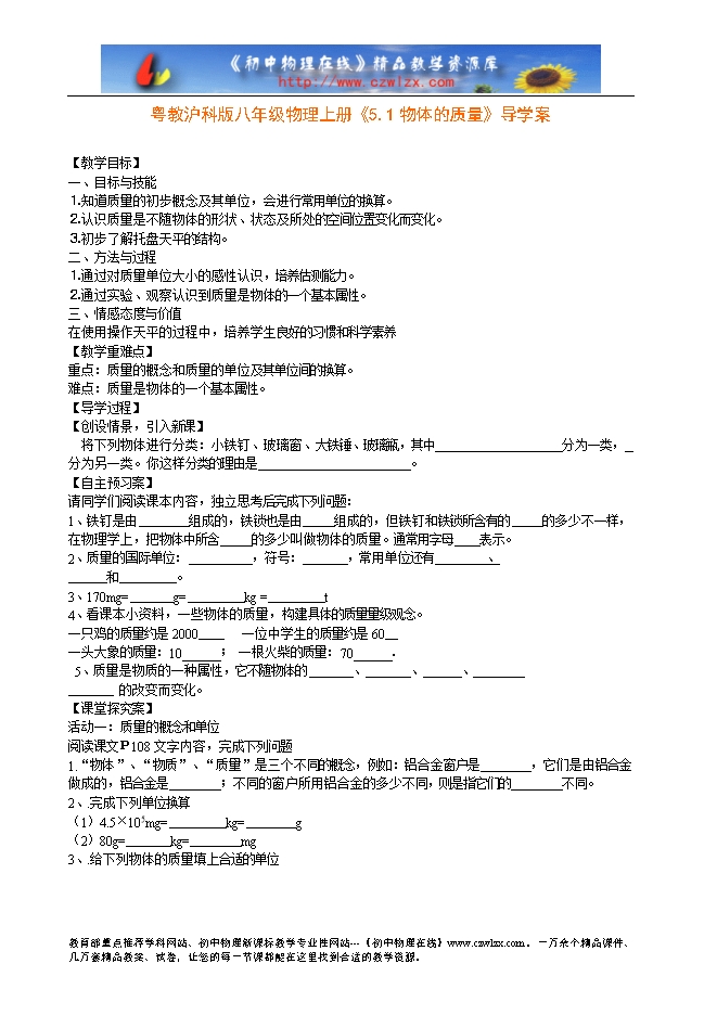 粤教沪科版八年级物理上册《5.1物体的质量》导学案