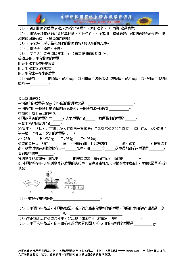 1、铁钉是由 组成的,铁锁也是由 组成的,但铁钉和铁锁所含有的 的多少不一样,在物理学上,把物体中所含 的多少叫做物体的质量。通常用字母 表示。