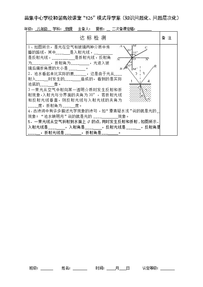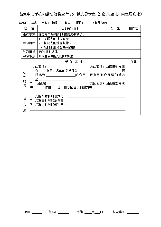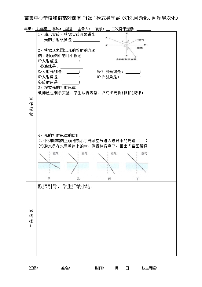 太和县苗集中心学校人教版八年级物理上册导学案:4.4光的折射