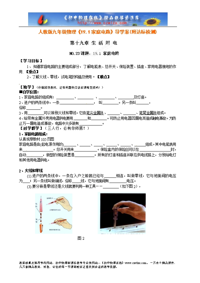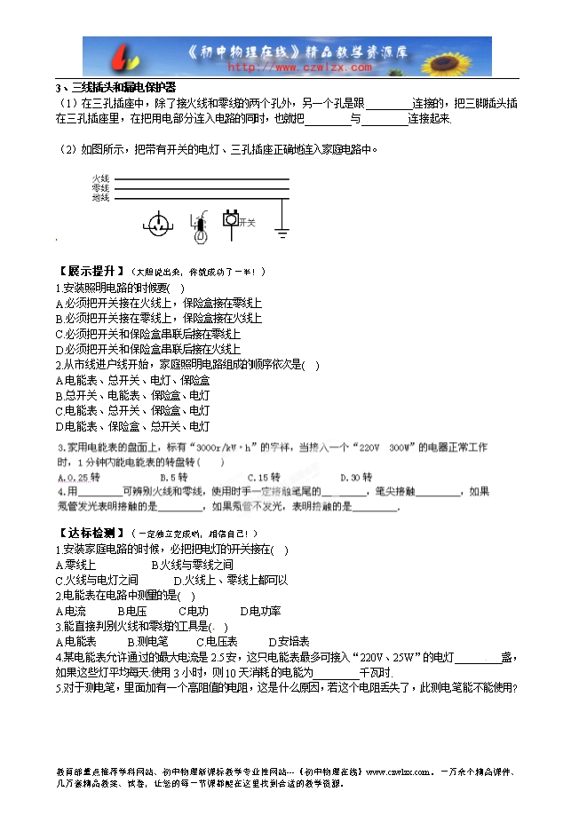 人教版九年级物理《19.1家庭电路》导学案(附达标检测)