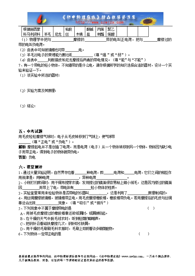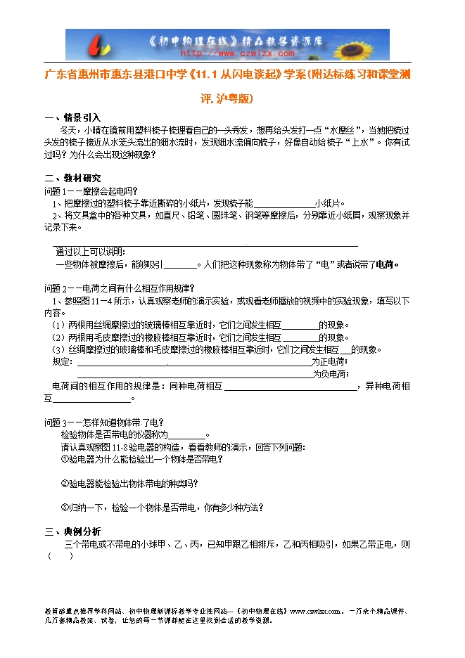 广东省惠州市惠东县港口中学《13.1从闪电谈起》学案(附达标练习和课堂测评,沪粤版)