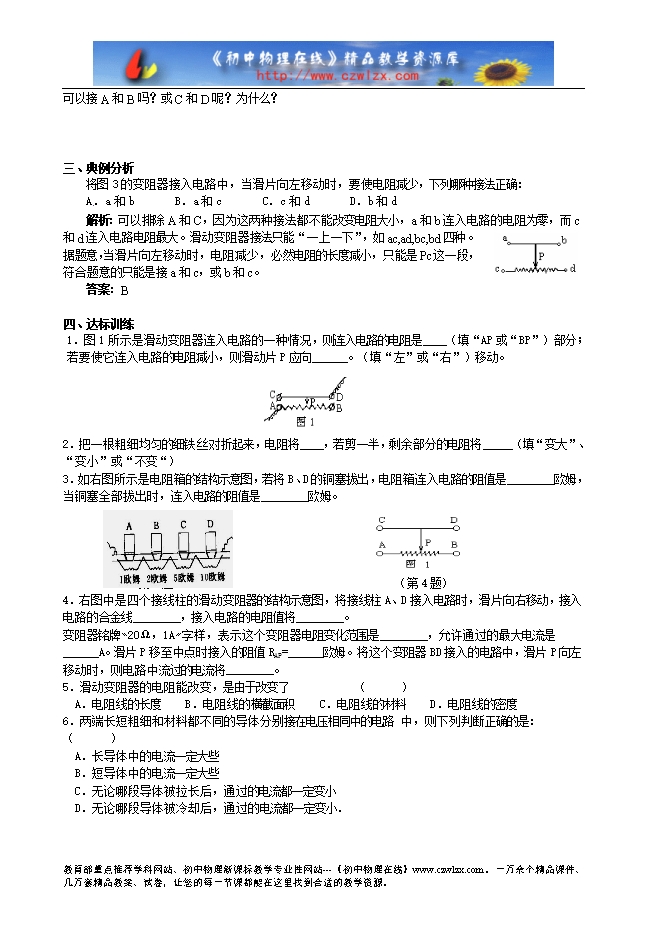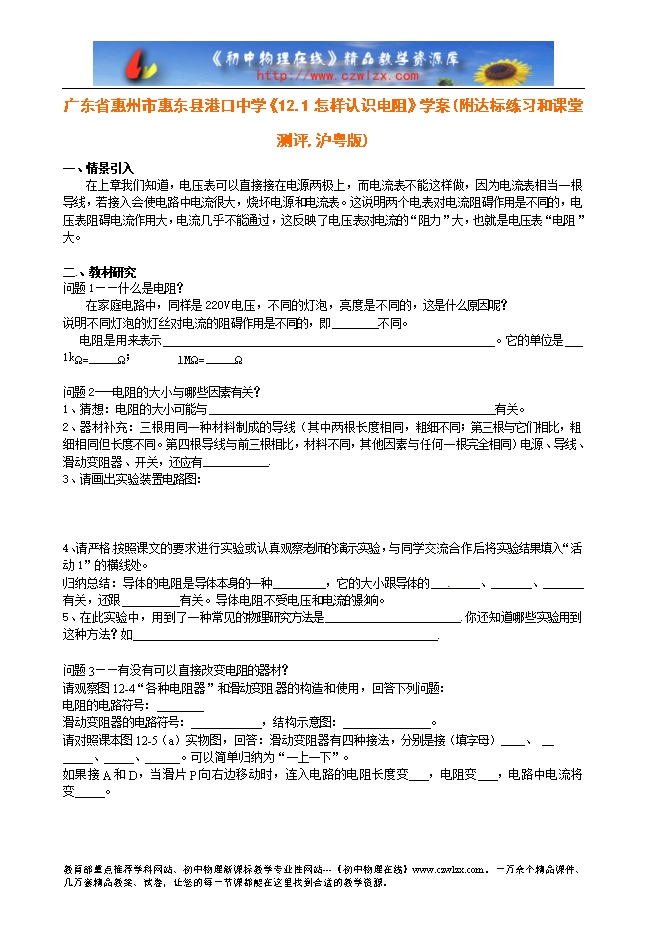 广东省惠州市惠东县港口中学《14.1怎样认识电阻》学案(附达标练习和课堂测评,沪粤版)