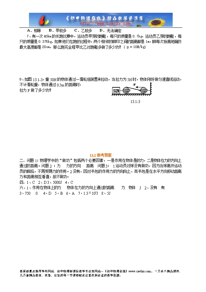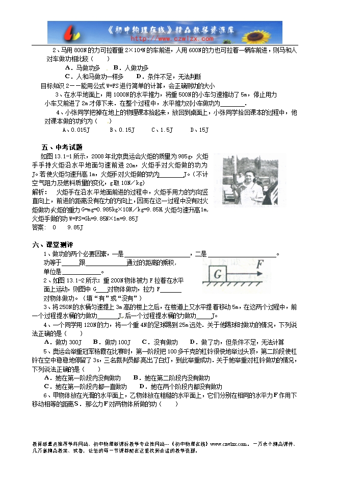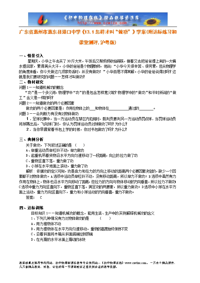广东省惠州市惠东县港口中学《11.1怎样才叫“做功”》学案(附达标练习和课堂测评,沪粤版)