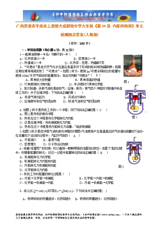 广西贵港市平南县上渡镇大成初级中学九年级《第14章 内能的利用》单元检测题及答案(人教版)