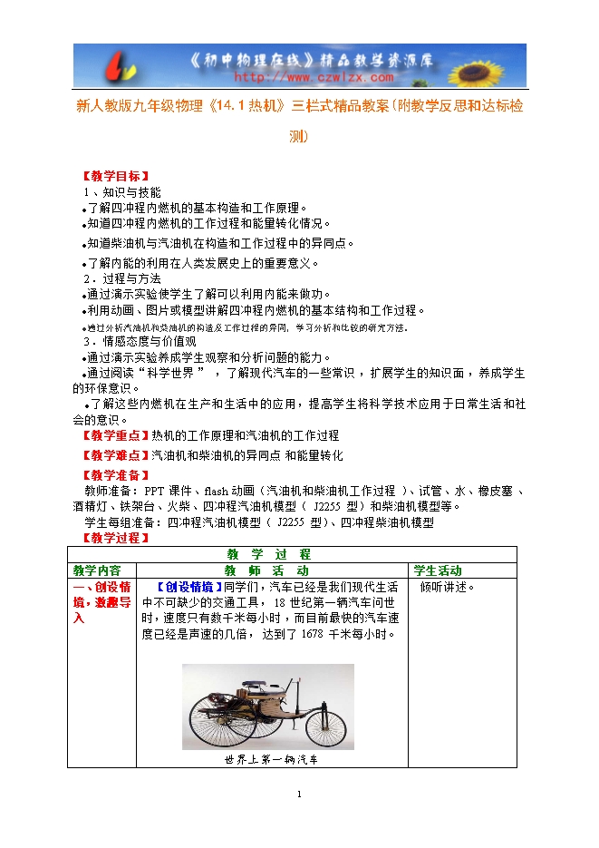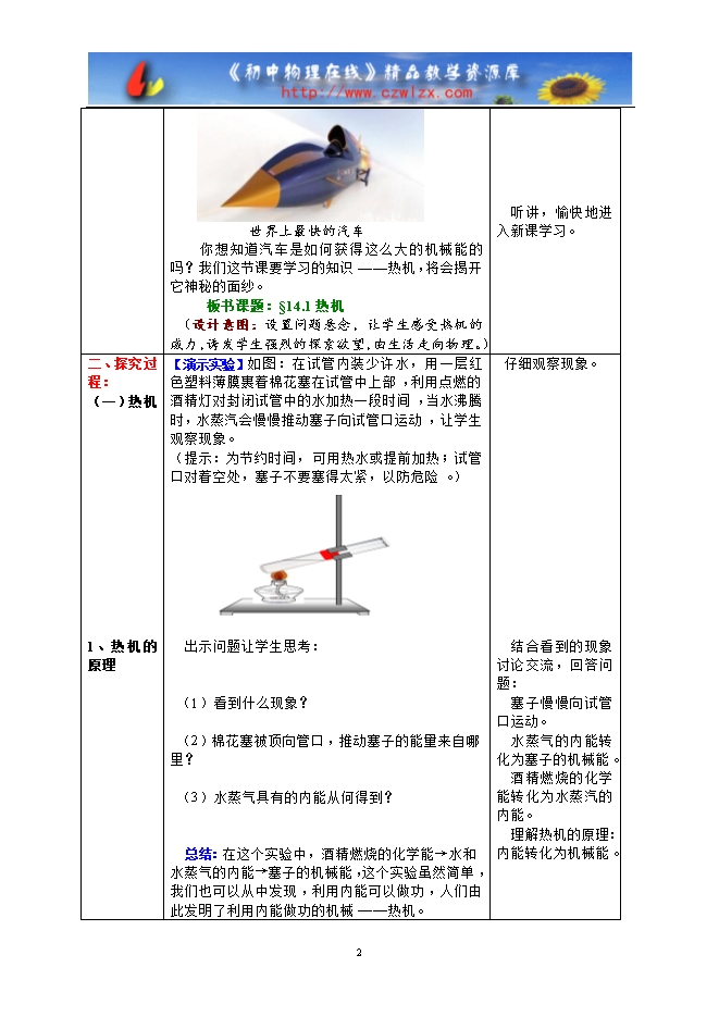 教师准备:PPT课件、flash动画(汽油机和柴油机工作过程)、试管、水、橡皮塞、酒精灯、铁架台、火柴、四冲程汽油机模型(J2255型)和柴油机模型等。