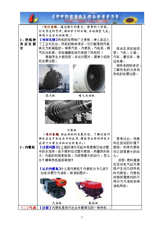 ●了解这些内燃机在生产和生活中的应用,提高学生将科学技术应用于日常生活和社会的意识。