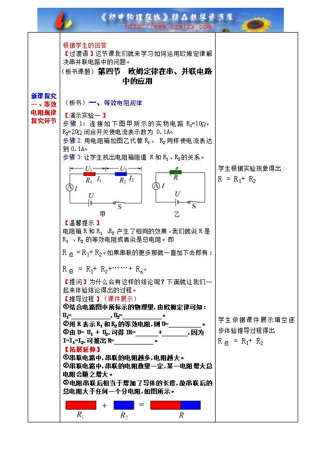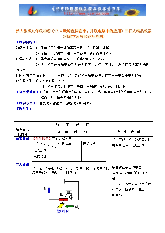 新人教版九年级物理《17.4欧姆定律在串、并联电路中的应用》三栏式精品教案(附教学反思和达标检测)