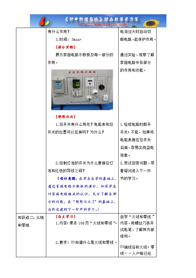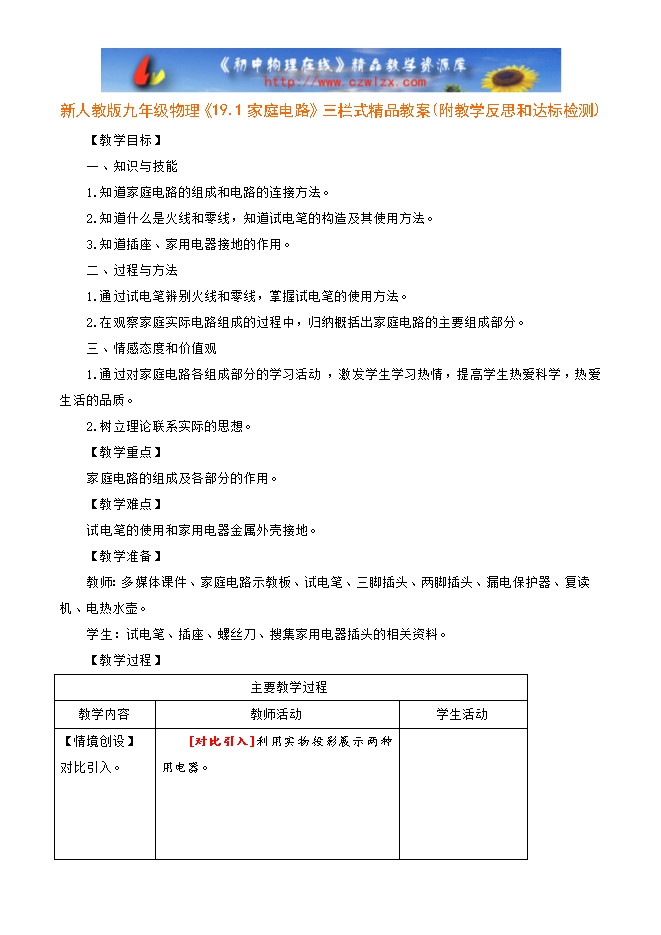 新人教版九年级物理《19.1家庭电路》三栏式精品教案(附教学反思和达标检测)