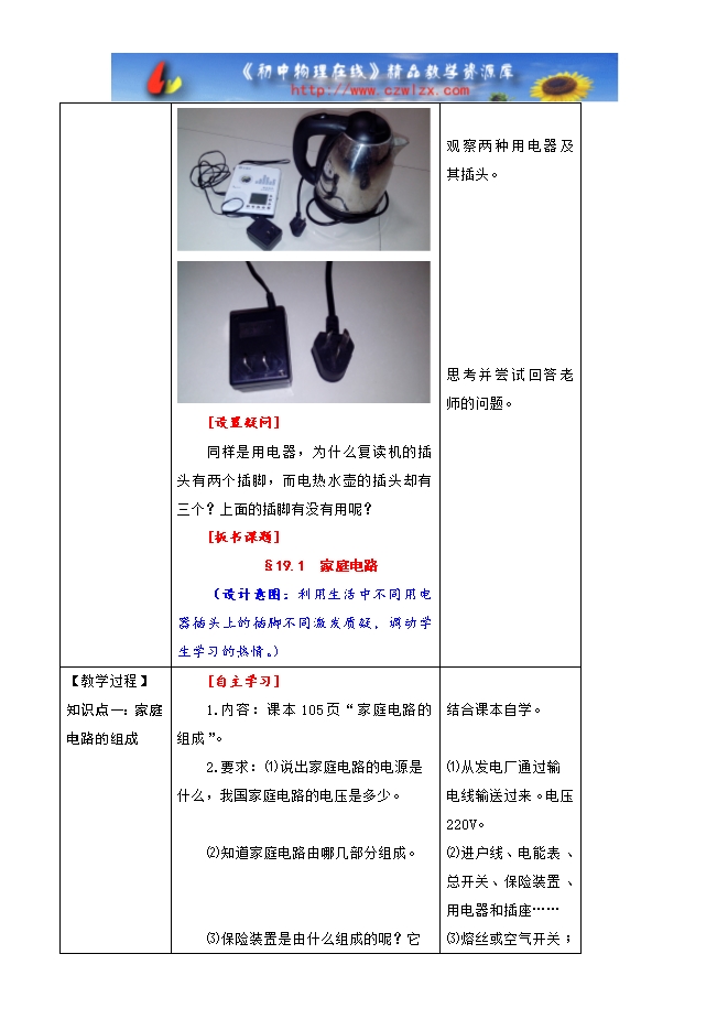 学生:试电笔、插座、螺丝刀、搜集家用电器插头的相关资料。