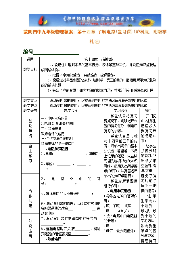 蒙阴四中九年级物理教案:第十四章 了解电路(复习课)(沪科版,附教学札记)