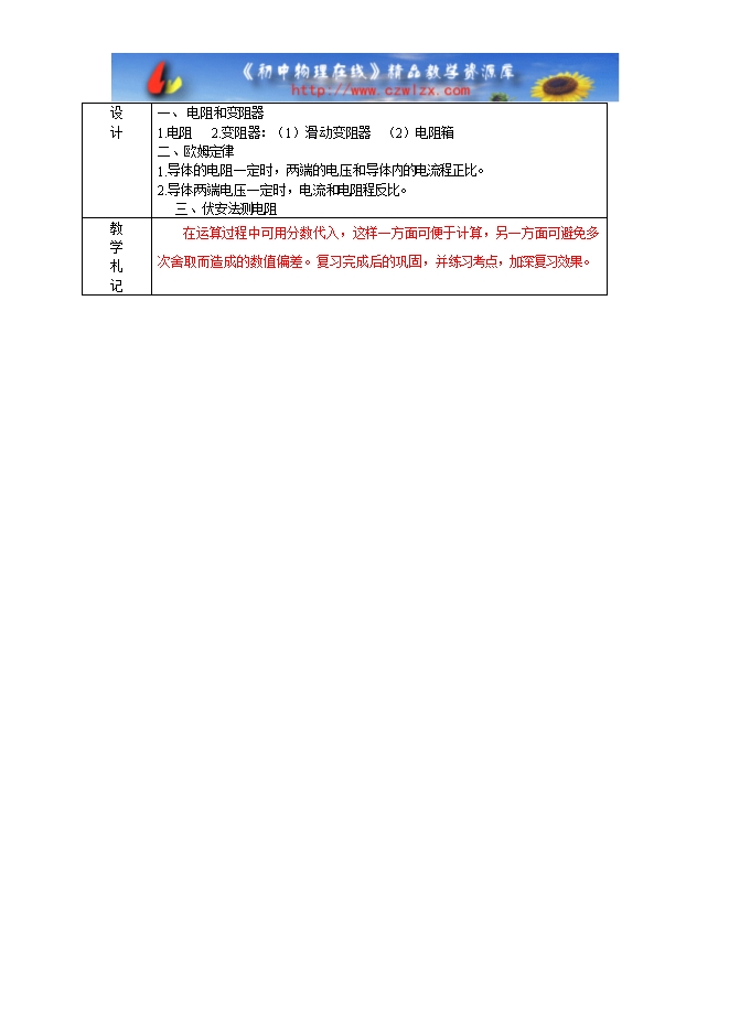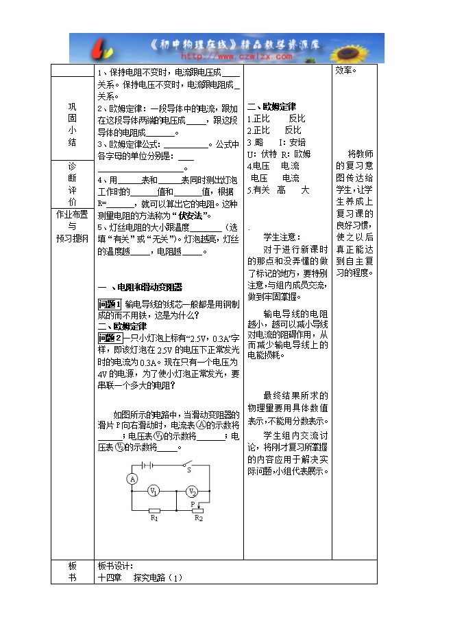 教学难点 滑动变阻器的使用,伏安法测电阻的方法及串并联等效电阻的运算