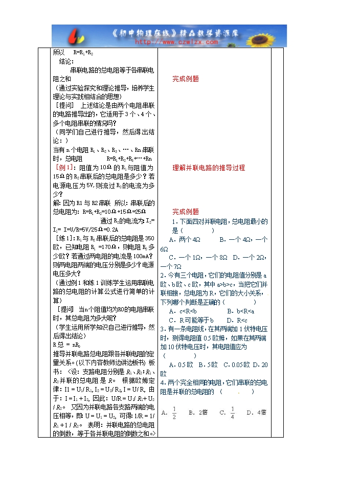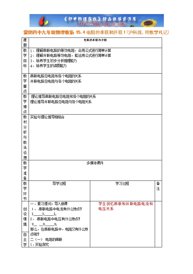 蒙阴四中九年级物理教案:15.4电阻的串联和并联1(沪科版,附教学札记)