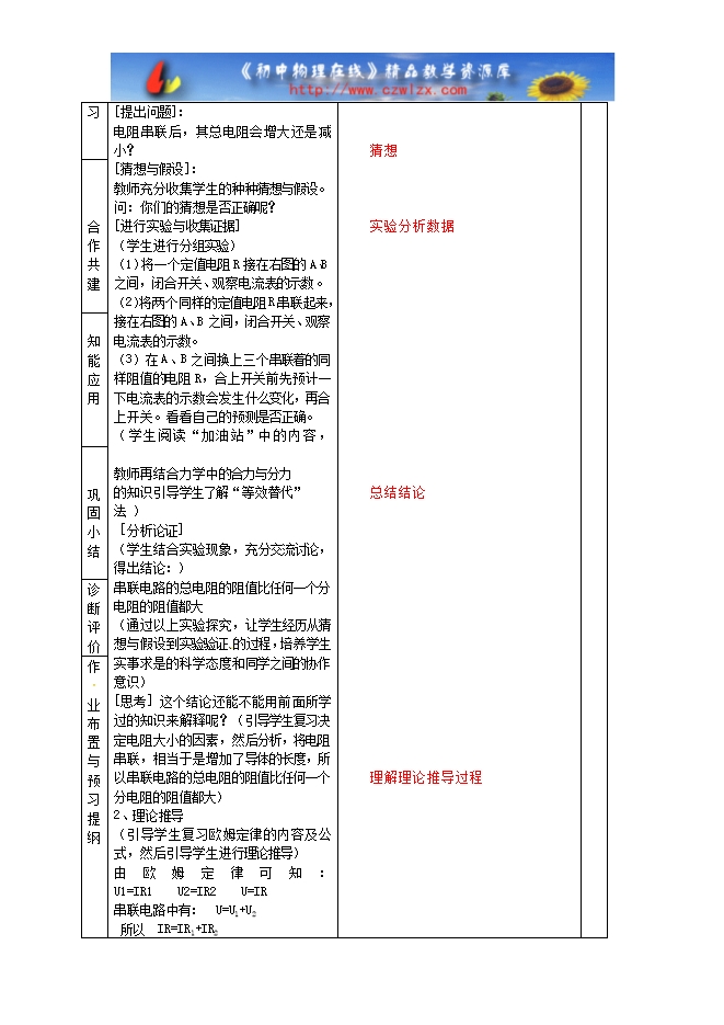 教学难点 理论推导串联电路总电阻和各个电阻的关系