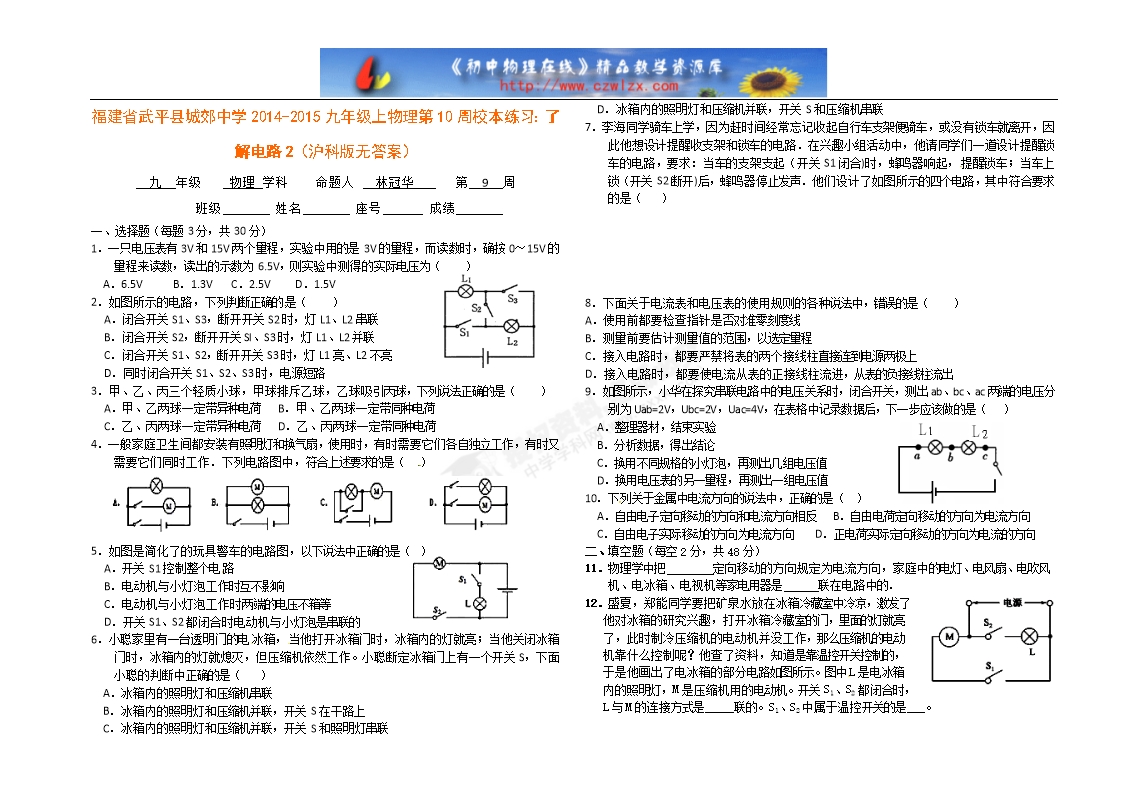 福建省武平县城郊中学2014-2015九年级上物理第10周校本练习:了解电路2(沪科版无答案)