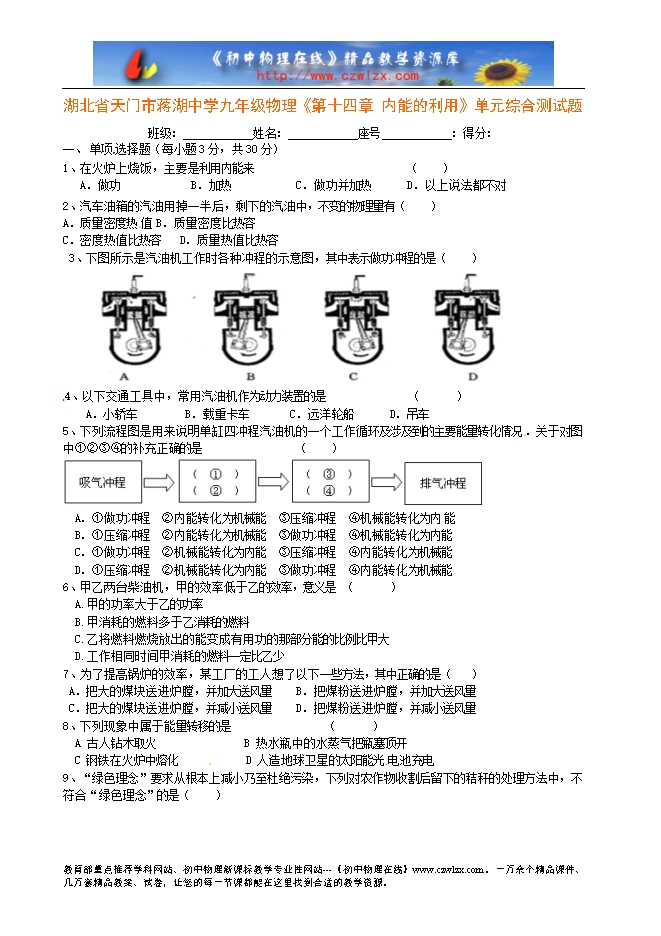湖北省天门市蒋湖中学九年级物理《第十四章 内能的利用》单元综合测试题