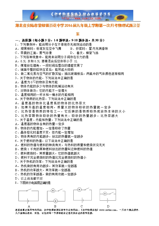 湖北省安陆市棠棣镇百花中学2016届九年级上学期第一次月考物理试题及答案
